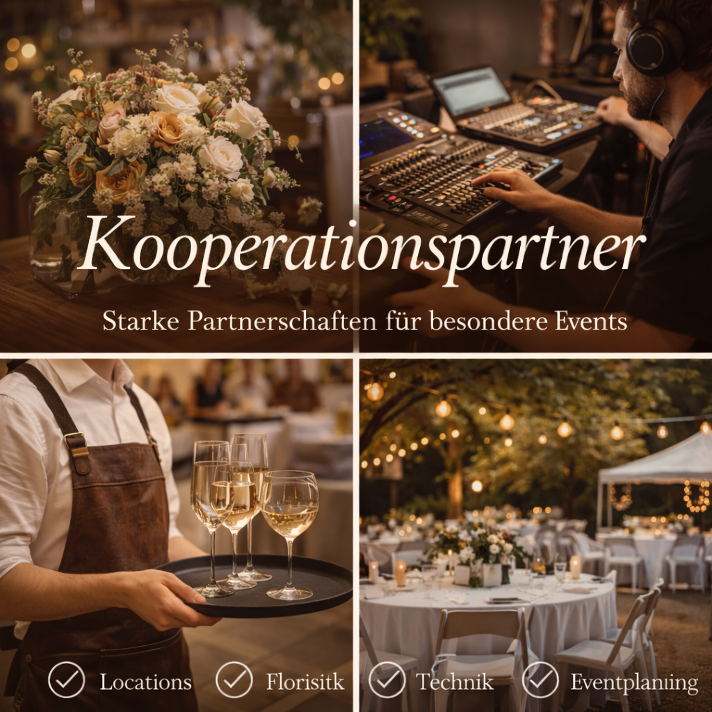 Ob Locations, Floristik, Technik, Eventplanung oder Getränkeauswahl – unser Netzwerk steht für Professionalität, Verlässlichkeit und Leidenschaft für Details.